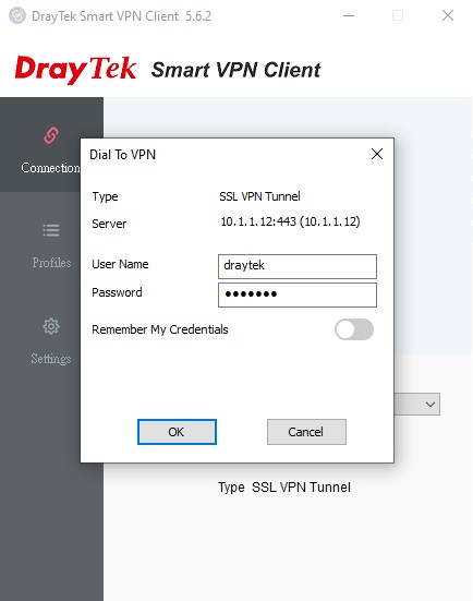6. Επιλέξτε το προφίλ που μόλις δημιουργήσατε και μεταβείτε γρήγορα στη Σύνδεση. Επιβεβαιώστε το User Name και το Password και πατήστε OK για να δημιουργήσετε τη σύνδεση VPN.